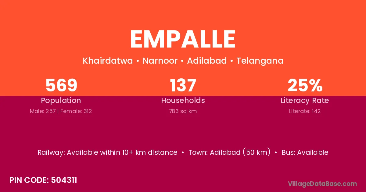 Adilabad (50 km) is the nearest town to Empalle village for major economic activities and is located approximately 50 km away.
