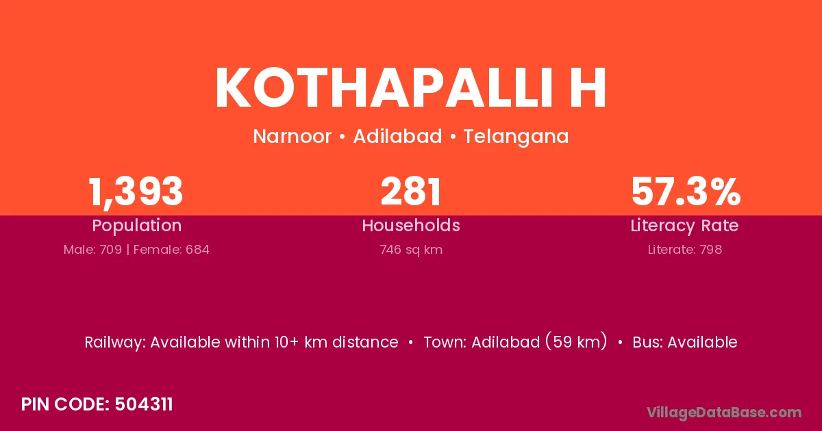 Adilabad (59 km) is the nearest town to Kothapalli H village for major economic activities and is located approximately 59 km away.