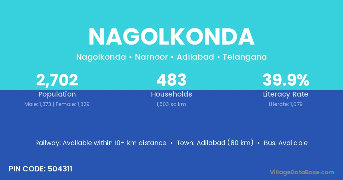 Adilabad (80 km) is the nearest town to Nagolkonda village for major economic activities and is located approximately 80 km away.