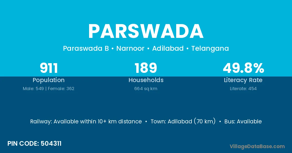Adilabad (70 km) is the nearest town to Parswada village for major economic activities and is located approximately 70 km away.