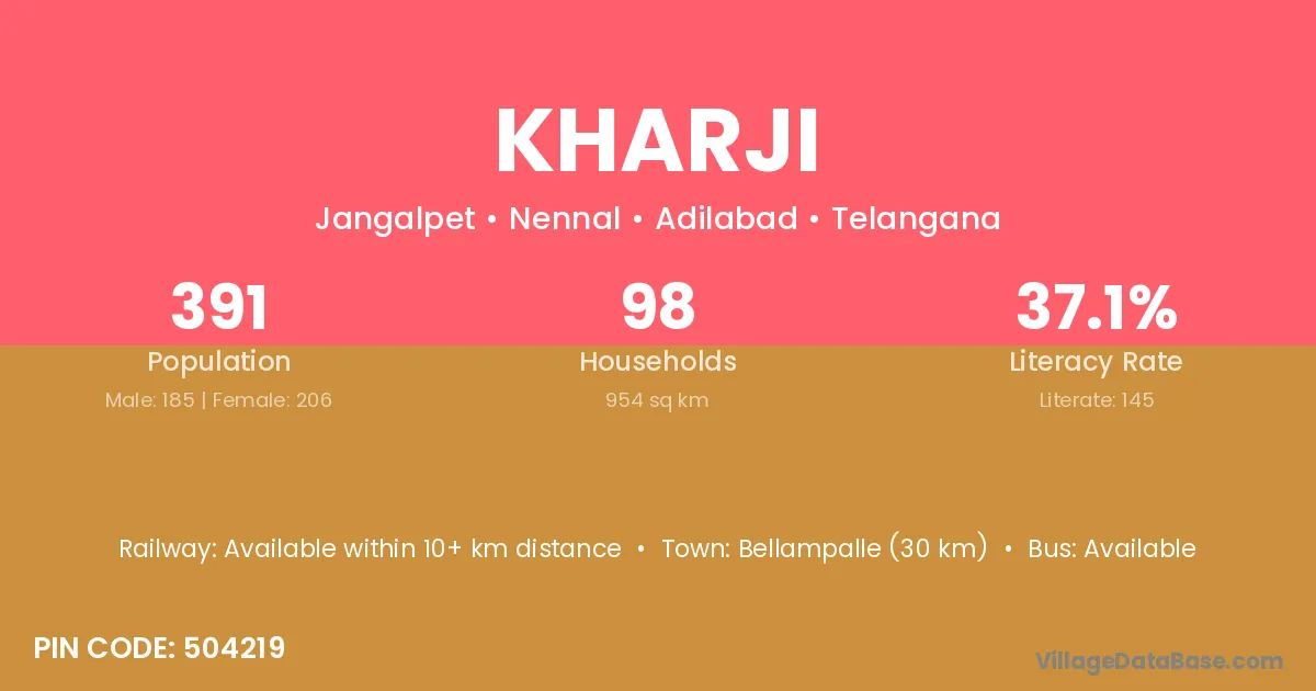 Bellampalle (30 km) is the nearest town to Kharji village for major economic activities and is located approximately 30 km away.