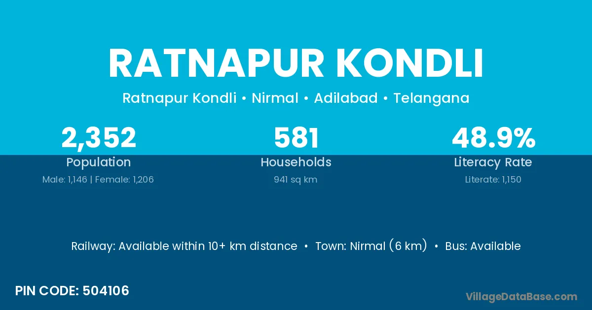 Nirmal (6 km) is the nearest town to Ratnapur Kondli village for major economic activities and is located approximately 6 km away.