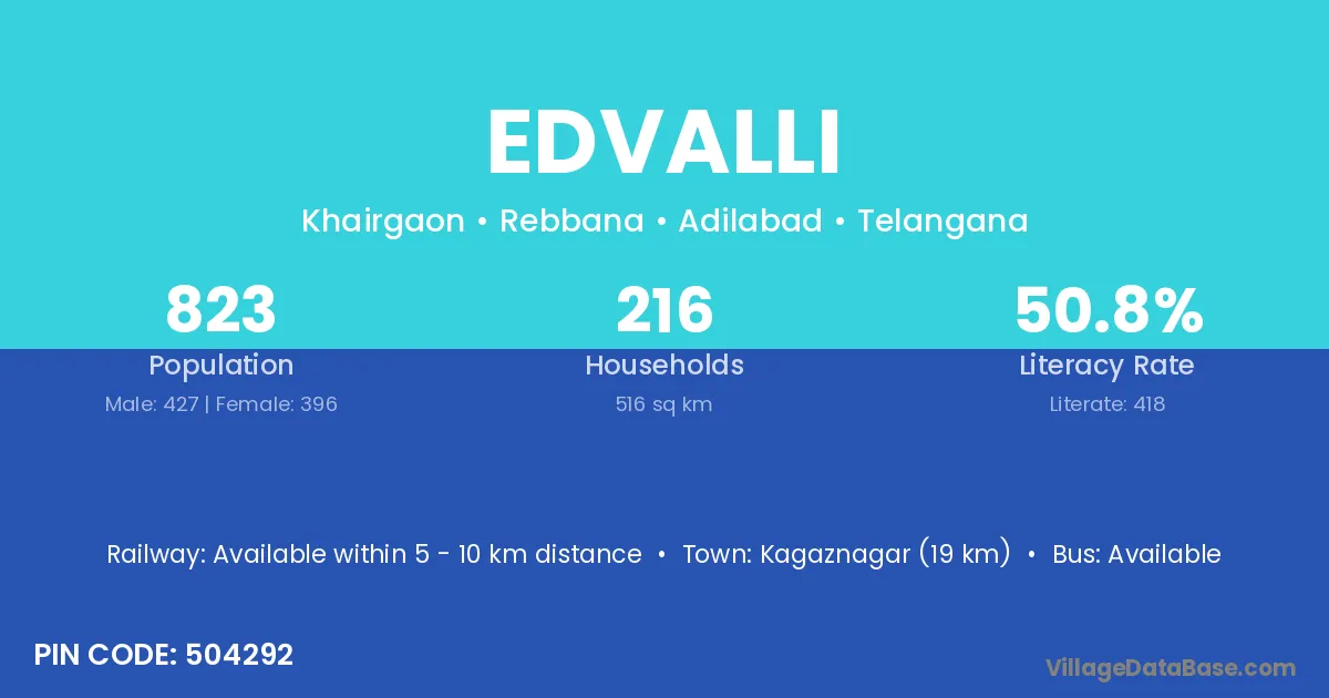 Kagaznagar (19 km) is the nearest town to Edvalli village for major economic activities and is located approximately 19 km away.
