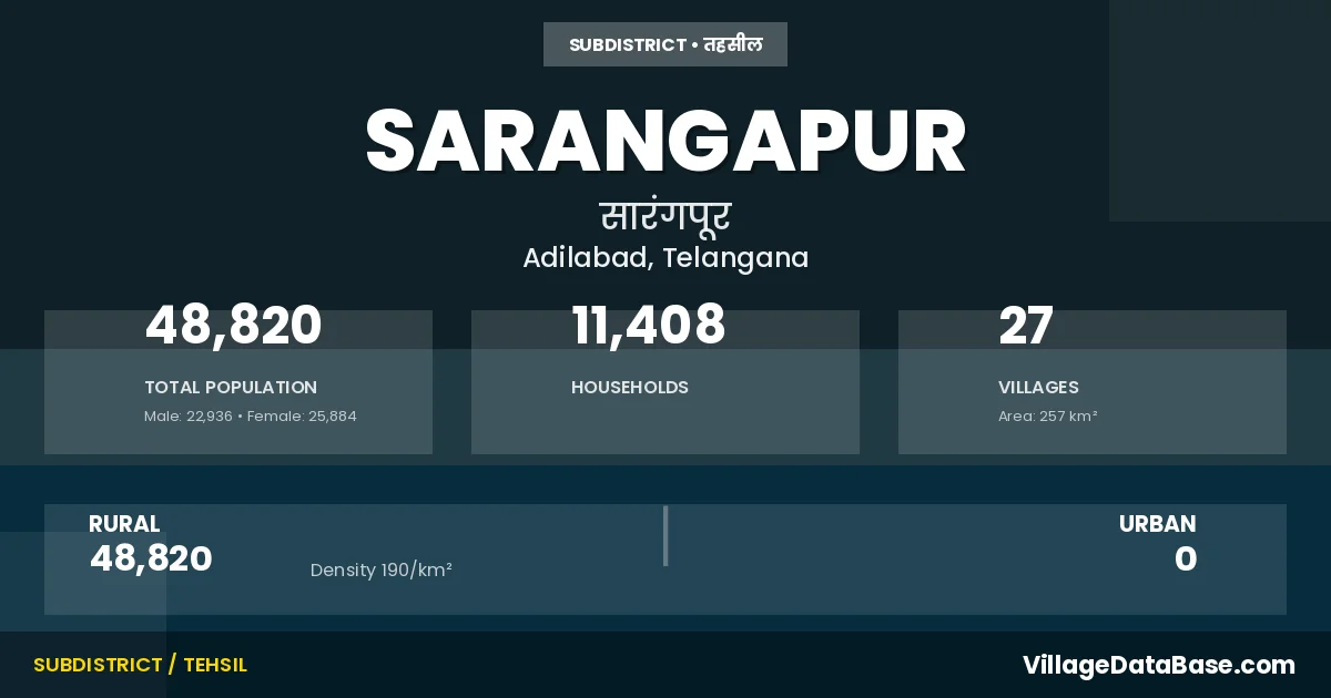 According to the 2011 census The total area of Sarangapur Mandal is 257 km², with a population of 48820 people. The population density is 190 inhabitants per square kilometre, and there are approximately 11408 houses in the sub district.