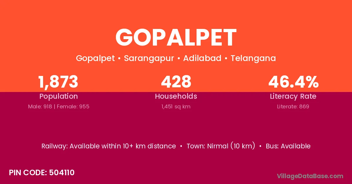 Nirmal (10 km) is the nearest town to Gopalpet village for major economic activities and is located approximately 10 km away.
