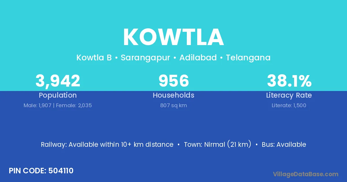 Nirmal (21 km) is the nearest town to Kowtla village for major economic activities and is located approximately 21 km away.