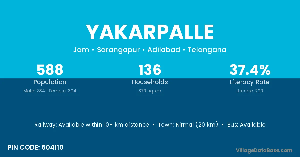Nirmal (20 km) is the nearest town to Yakarpalle village for major economic activities and is located approximately 20 km away.