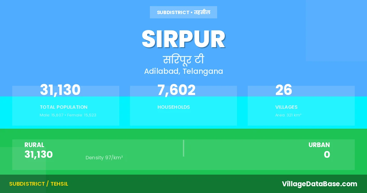 According to the 2011 census The total area of Sirpur Mandal is 321 km², with a population of 31130 people. The population density is 97 inhabitants per square kilometre, and there are approximately 7602 houses in the sub district.