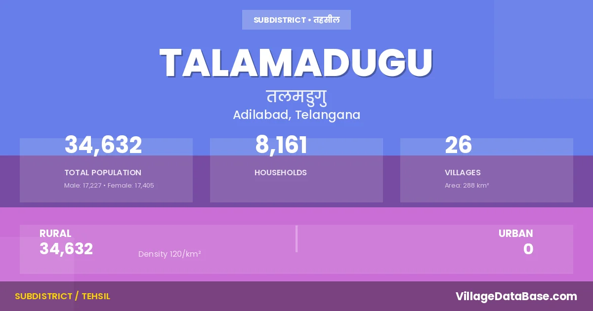 Talamadugu is a town and Mandal in the Adilabad district of the Telangana. In India, a Mandal is a subdivision of a district responsible for the administration and revenue collection of a specific area within the district. Mandals play a crucial role in the local governance structure, contributing significantly to the development and administration of their communities.