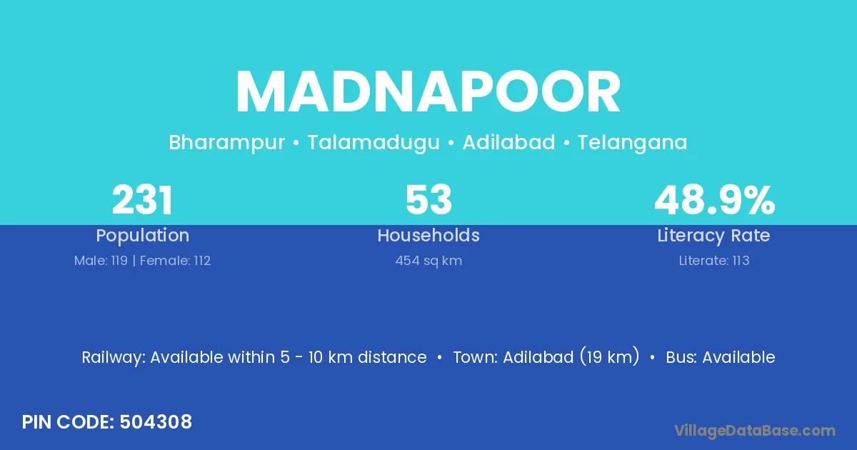 Adilabad (19 km) is the nearest town to Madnapoor village for major economic activities and is located approximately 19 km away.