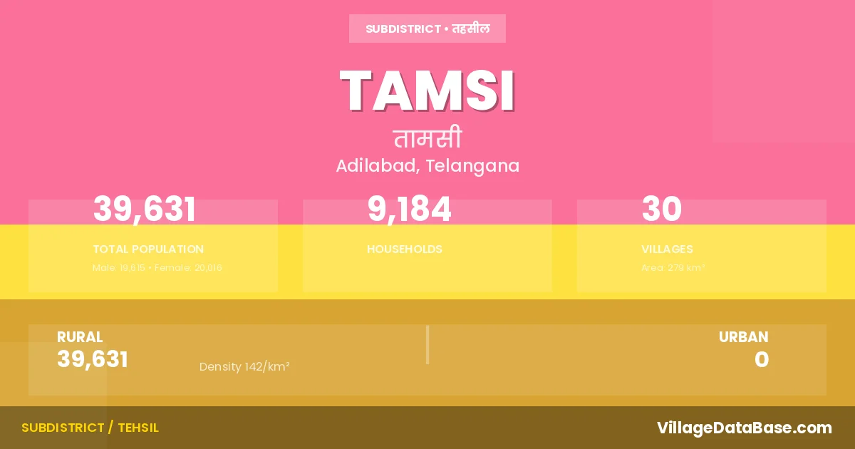 According to the 2011 census The total area of Tamsi Mandal is 279 km², with a population of 39631 people. The population density is 142 inhabitants per square kilometre, and there are approximately 9184 houses in the sub district.