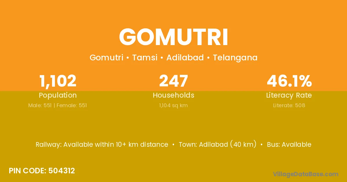 Adilabad (40 km) is the nearest town to Gomutri village for major economic activities and is located approximately 40 km away.
