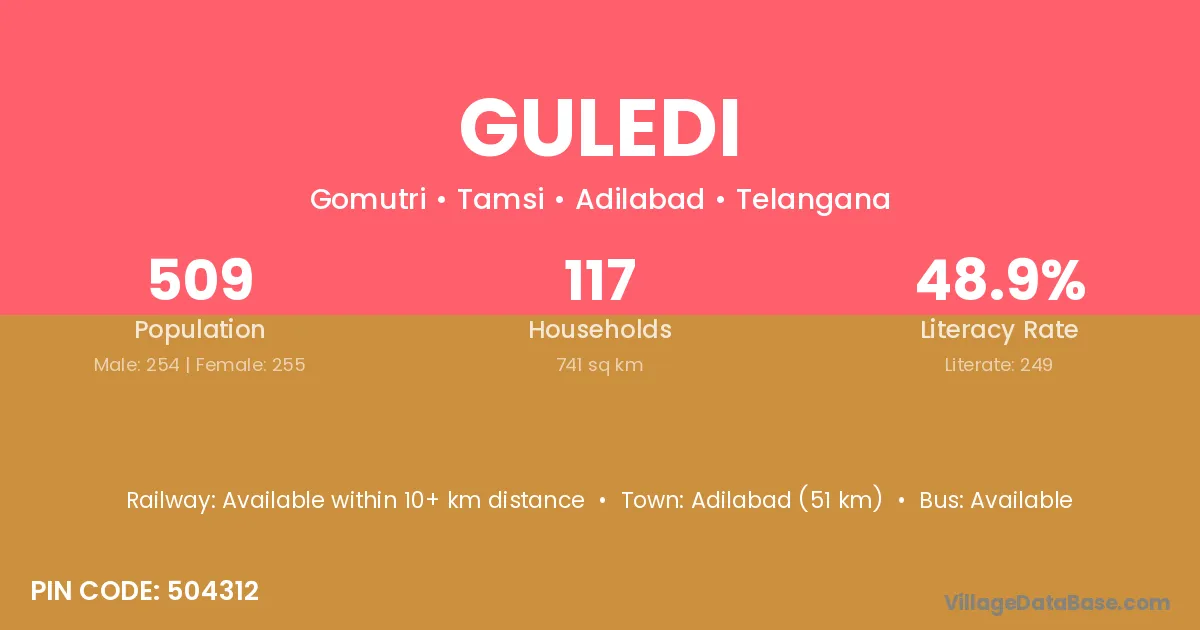 Adilabad (51 km) is the nearest town to Guledi village for major economic activities and is located approximately 51 km away.