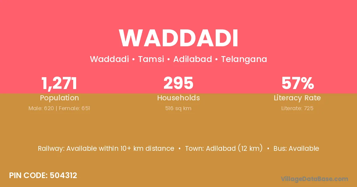 Adilabad (12 km) is the nearest town to Waddadi village for major economic activities and is located approximately 12 km away.