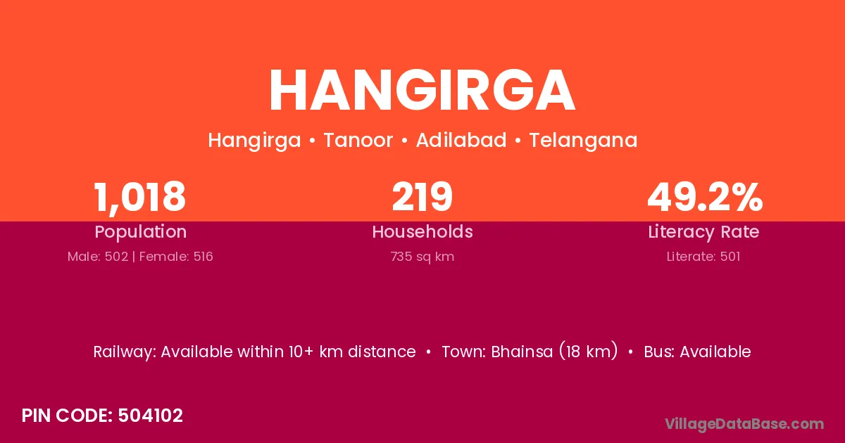 Hangirga village has a total population of 1,018 people, of which 502 are males and 516 are females.