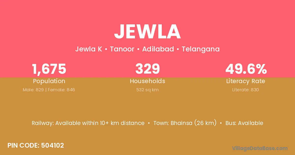 According to Census 2011 information, the village code of Jewla village is 504102.