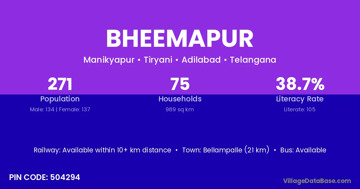 Bellampalle (21 km) is the nearest town to Bheemapur village for major economic activities and is located approximately 21 km away.