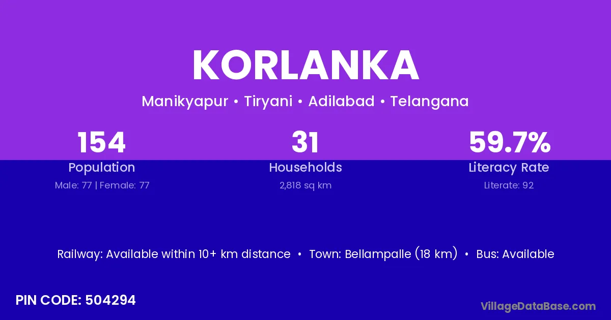 Bellampalle (18 km) is the nearest town to Korlanka village for major economic activities and is located approximately 18 km away.