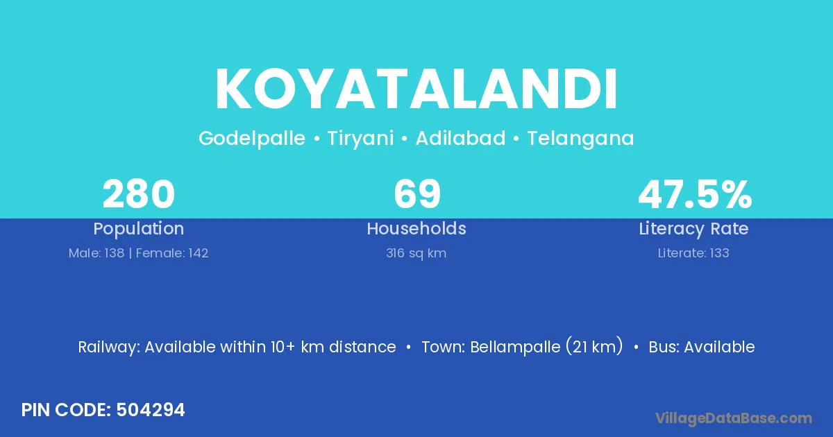 Bellampalle (21 km) is the nearest town to Koyatalandi village for major economic activities and is located approximately 21 km away.