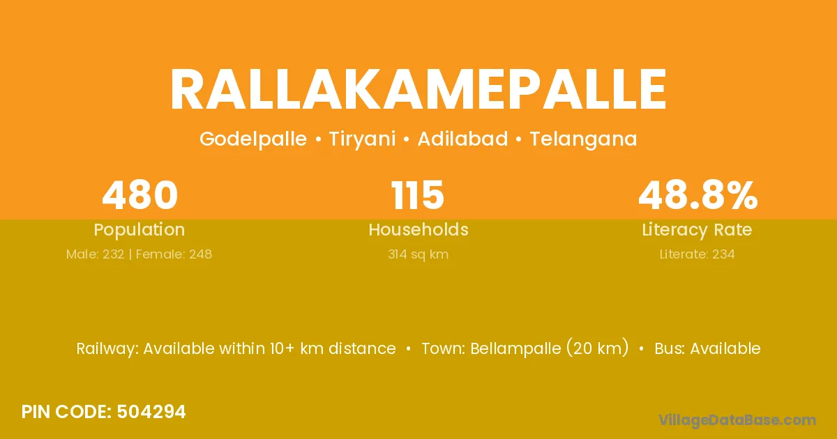 Rallakamepalle village has a total population of 480 people, of which 232 are males and 248 are females.