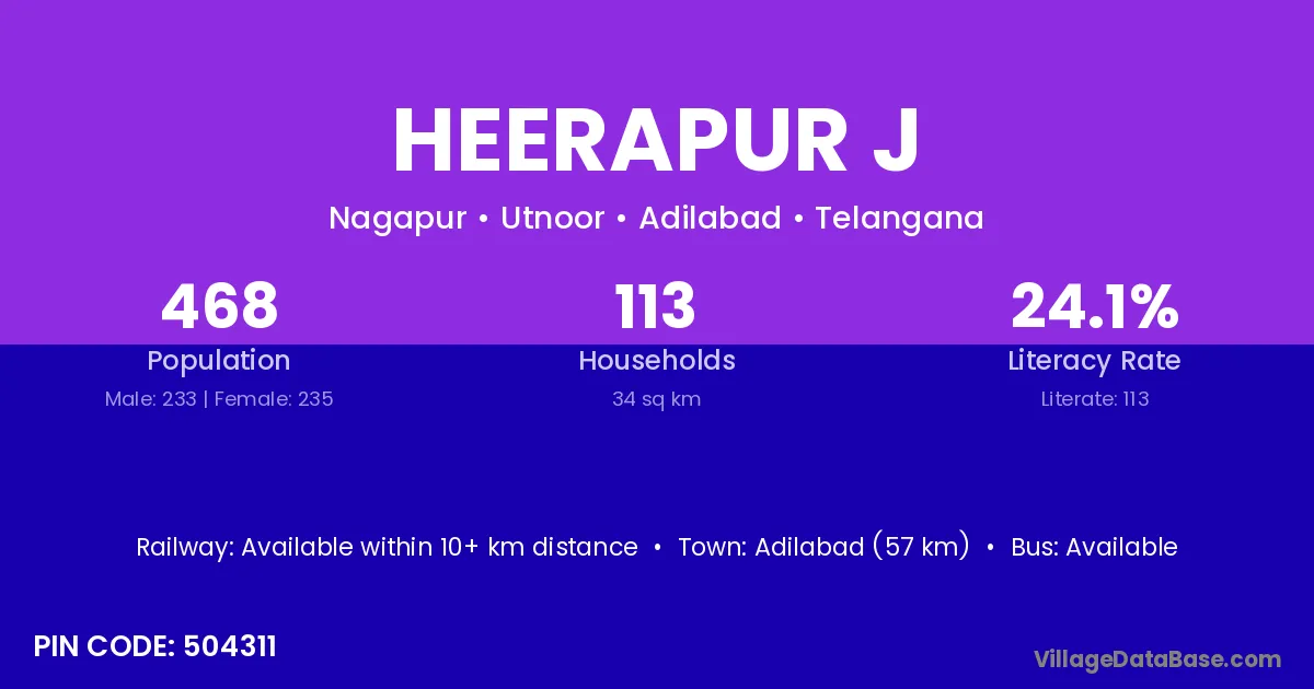 Adilabad (57 km) is the nearest town to Heerapur J village for major economic activities and is located approximately 57 km away.