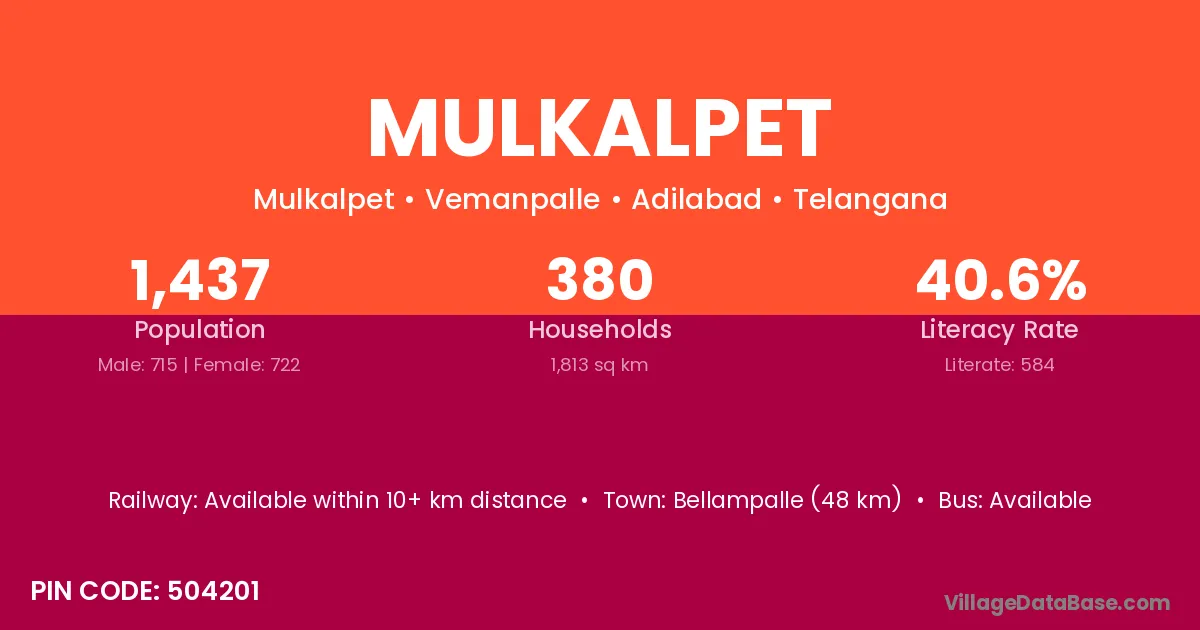 Bellampalle (48 km) is the nearest town to Mulkalpet village for major economic activities and is located approximately 48 km away.