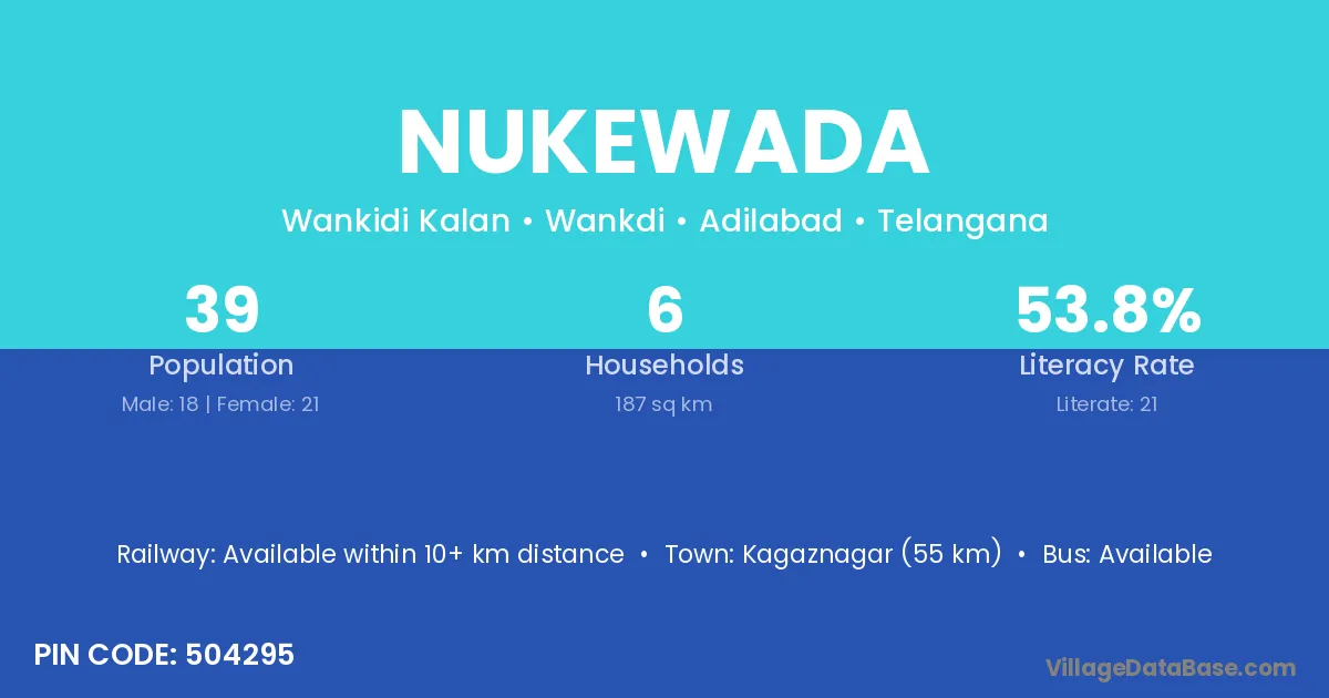 Kagaznagar (55 km) is the nearest town to Nukewada village for major economic activities and is located approximately 55 km away.