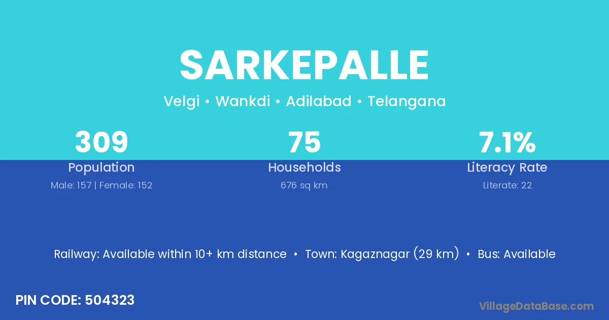 Kagaznagar (29 km) is the nearest town to Sarkepalle village for major economic activities and is located approximately 29 km away.