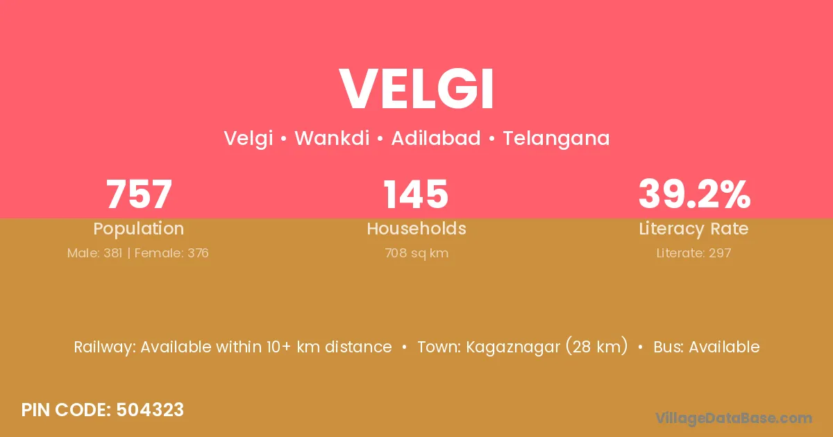 Kagaznagar (28 km) is the nearest town to Velgi village for major economic activities and is located approximately 28 km away.