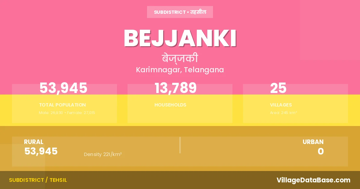 According to the 2011 census The total area of Bejjanki Mandal is 245 km², with a population of 53945 people. The population density is 221 inhabitants per square kilometre, and there are approximately 13789 houses in the sub district.