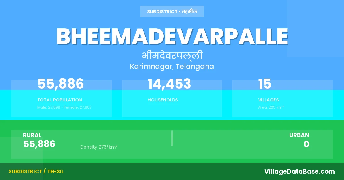 According to the 2011 census The total area of Bheemadevarpalle Mandal is 205 km², with a population of 55886 people. The population density is 273 inhabitants per square kilometre, and there are approximately 14453 houses in the sub district.