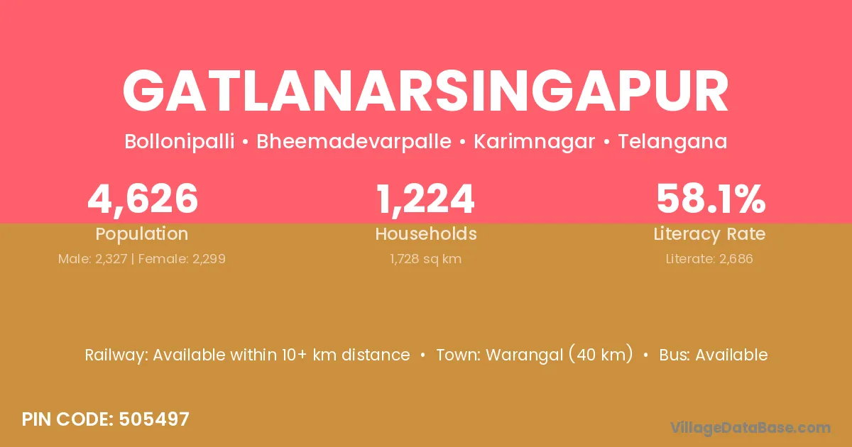 Warangal (40 km) is the nearest town to Gatlanarsingapur village for major economic activities and is located approximately 40 km away.