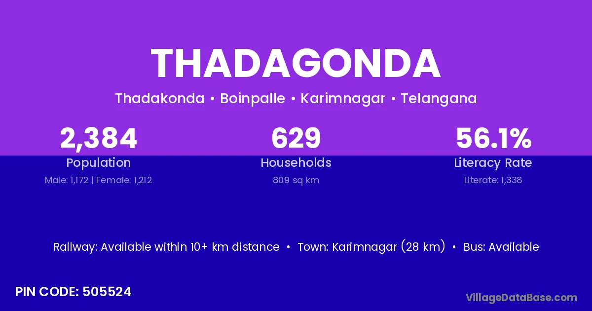 Karimnagar (28 km) is the nearest town to Thadagonda village for major economic activities and is located approximately 28 km away.