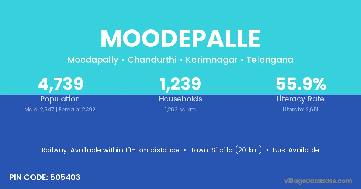 Sircilla (20 km) is the nearest town to Moodepalle village for major economic activities and is located approximately 20 km away.