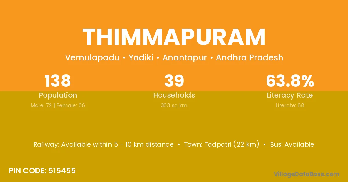 The literacy rate of Thimmapuram village is 50.37%. Male literacy stands at 59.21% and female literacy at 41.56%.