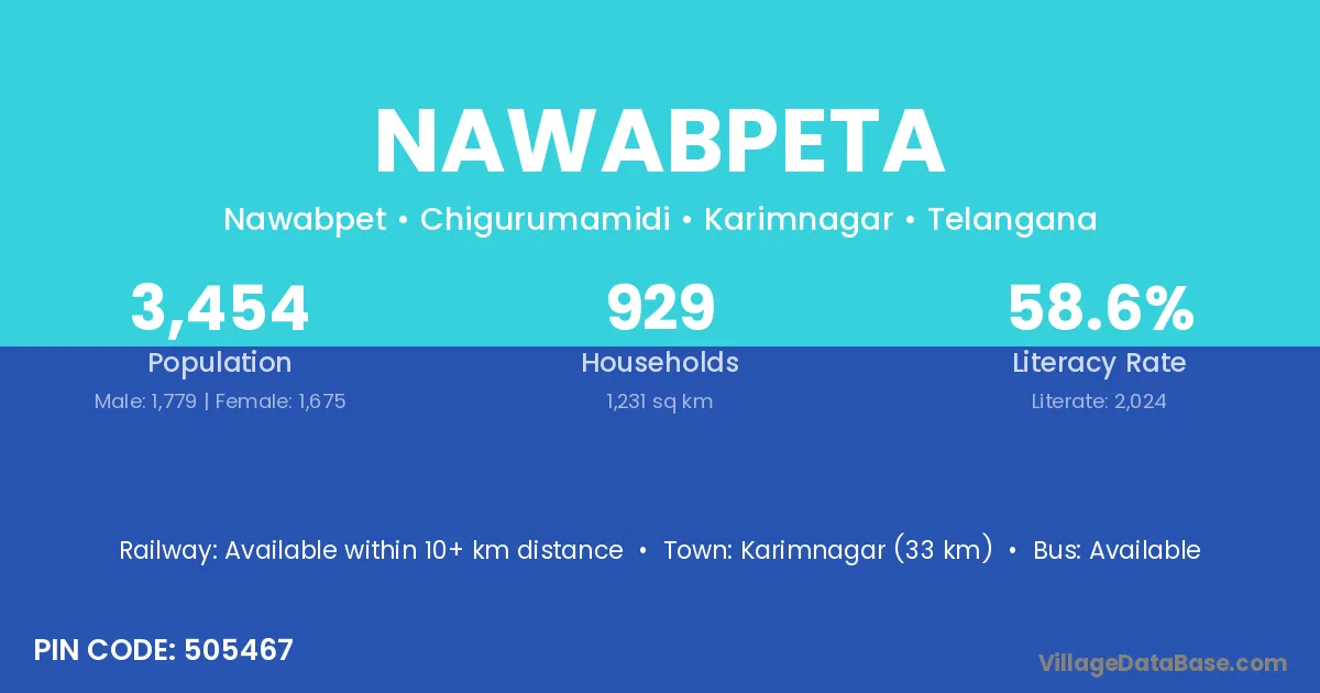 Karimnagar (33 km) is the nearest town to Nawabpeta village for major economic activities and is located approximately 33 km away.