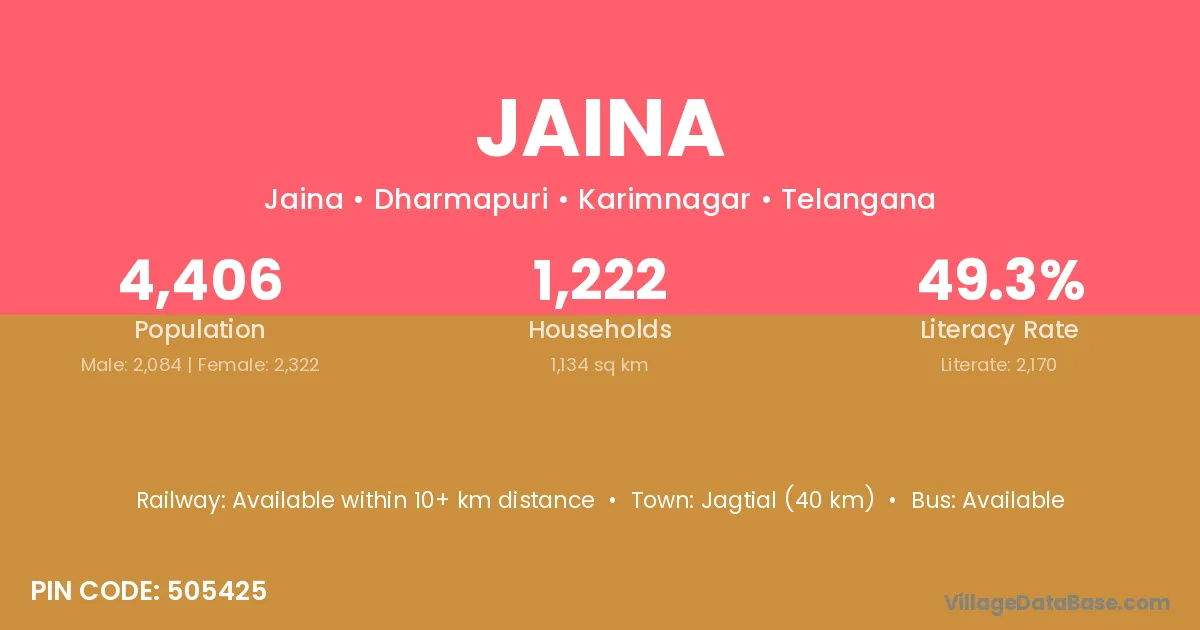 Jagtial (40 km) is the nearest town to Jaina village for major economic activities and is located approximately 40 km away.