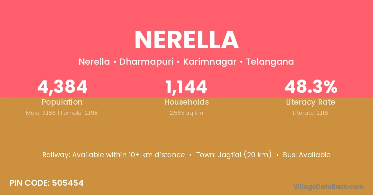 Jagtial (20 km) is the nearest town to Nerella village for major economic activities and is located approximately 20 km away.