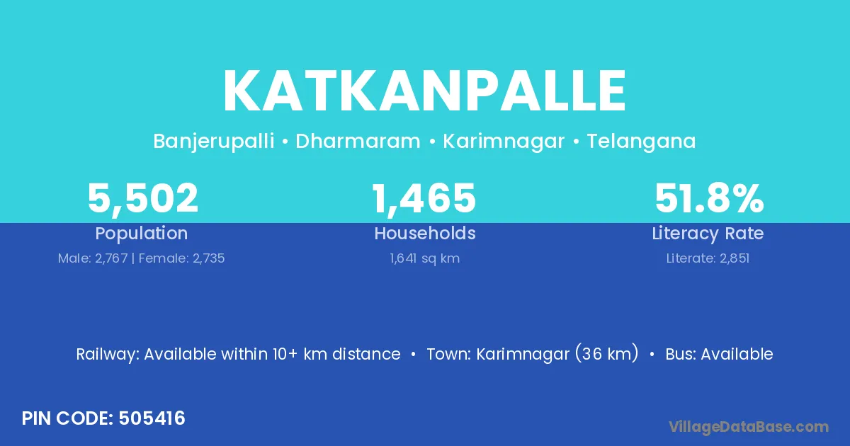 Karimnagar (36 km) is the nearest town to Katkanpalle village for major economic activities and is located approximately 36 km away.