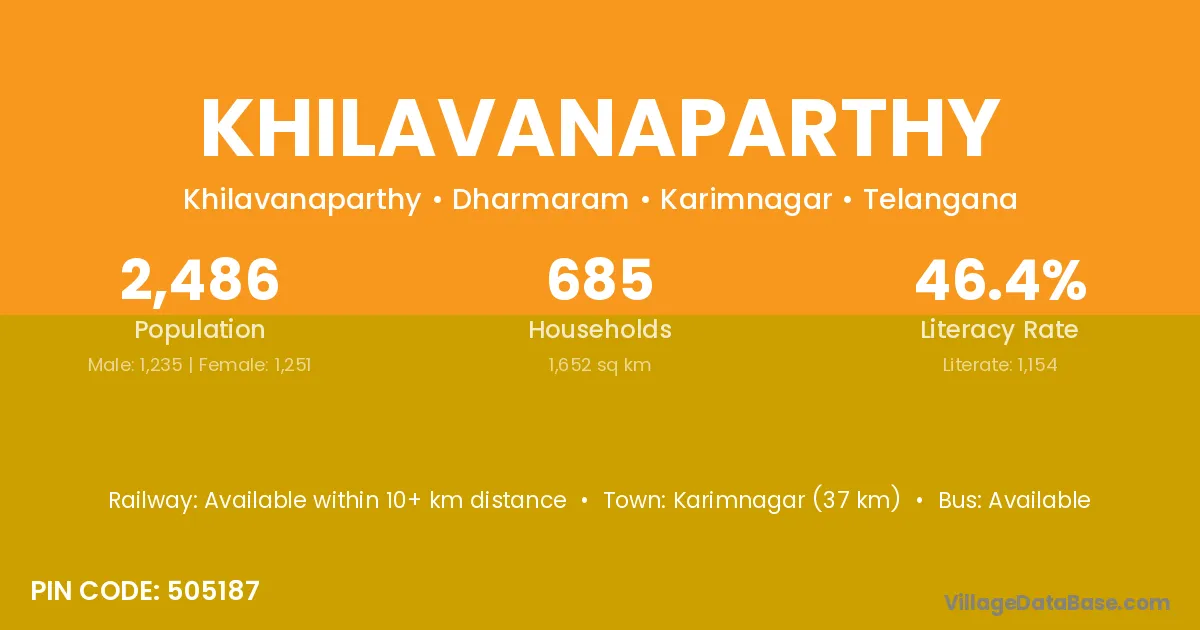 Karimnagar (37 km) is the nearest town to Khilavanaparthy village for major economic activities and is located approximately 37 km away.