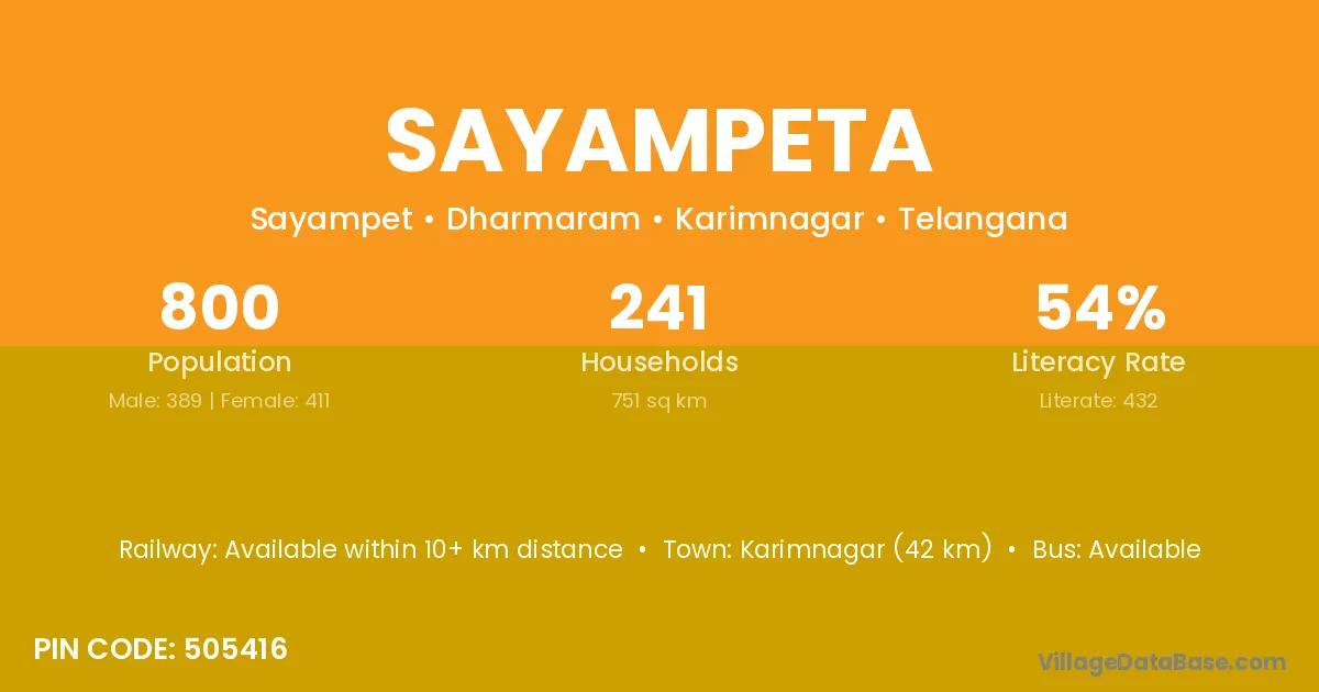Karimnagar (42 km) is the nearest town to Sayampeta village for major economic activities and is located approximately 42 km away.