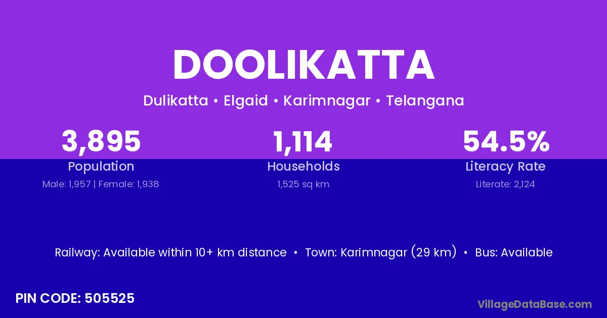 Karimnagar (29 km) is the nearest town to Doolikatta village for major economic activities and is located approximately 29 km away.