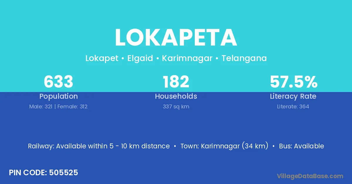 Karimnagar (34 km) is the nearest town to Lokapeta village for major economic activities and is located approximately 34 km away.
