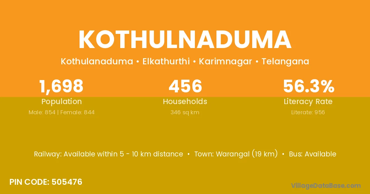 Warangal (19 km) is the nearest town to Kothulnaduma village for major economic activities and is located approximately 19 km away.