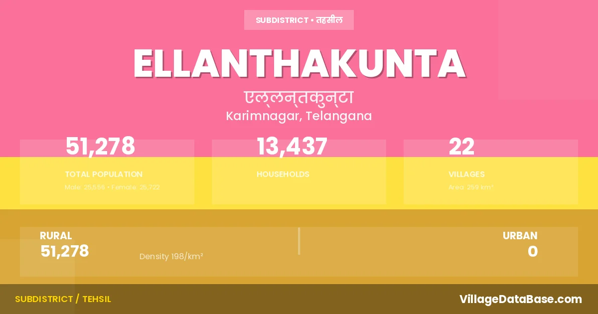 According to the 2011 census The total area of Ellanthakunta Mandal is 259 km², with a population of 51278 people. The population density is 198 inhabitants per square kilometre, and there are approximately 13437 houses in the sub district.