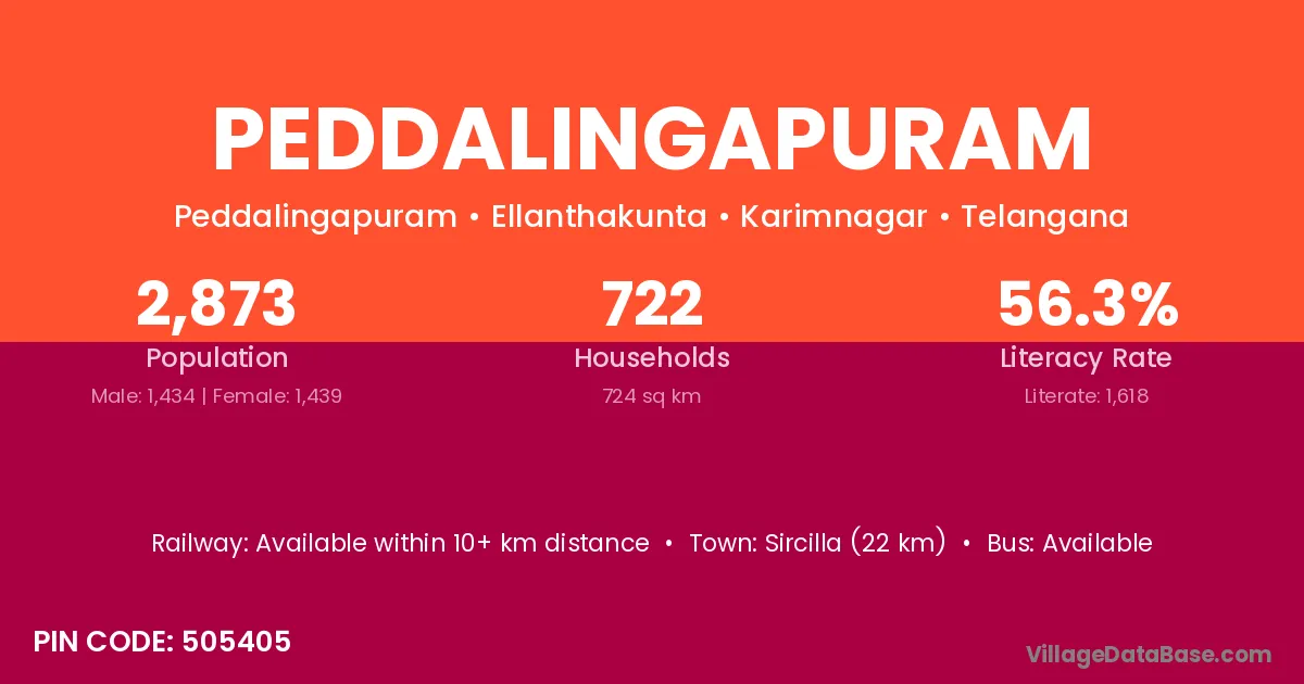 Sircilla (22 km) is the nearest town to Peddalingapuram village for major economic activities and is located approximately 22 km away.
