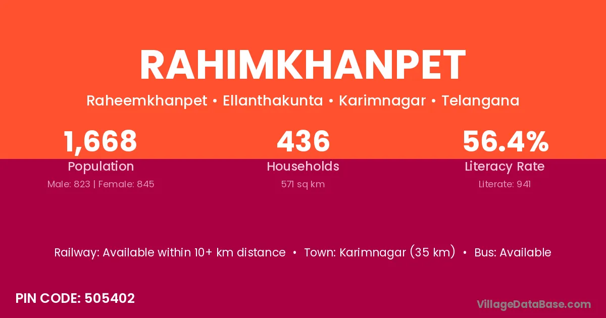 Karimnagar (35 km) is the nearest town to Rahimkhanpet village for major economic activities and is located approximately 35 km away.