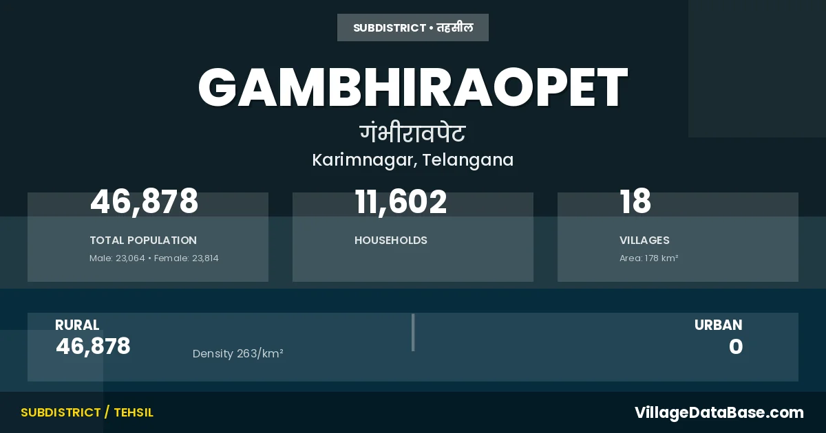 According to the 2011 census The total area of Gambhiraopet Mandal is 178 km², with a population of 46878 people. The population density is 263 inhabitants per square kilometre, and there are approximately 11602 houses in the sub district.