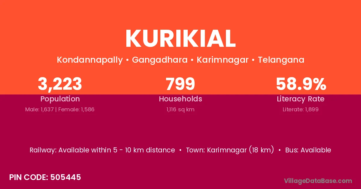 Karimnagar (18 km) is the nearest town to Kurikial village for major economic activities and is located approximately 18 km away.