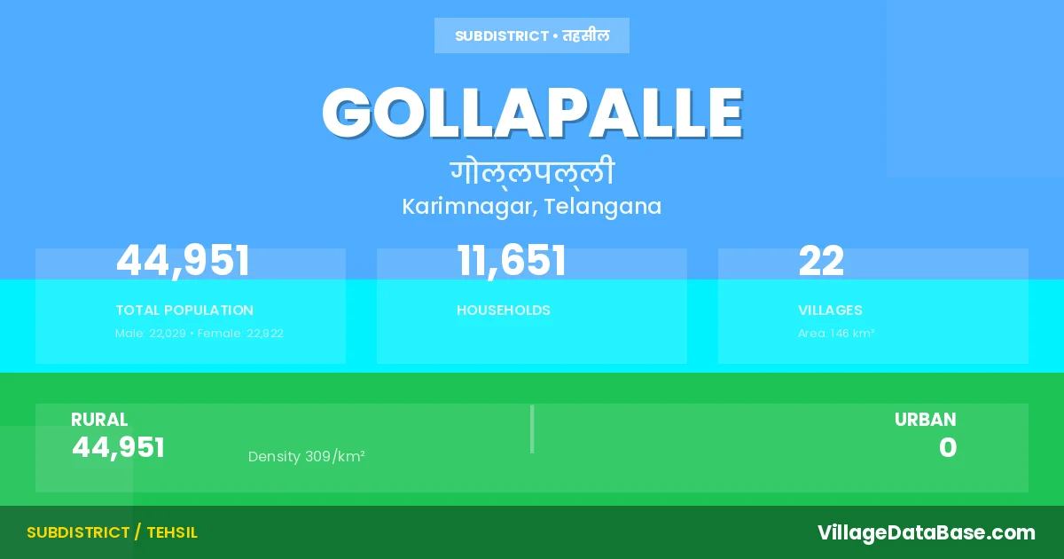 Gollapalle is a town and Mandal in the Karimnagar district of the Telangana. In India, a Mandal is a subdivision of a district responsible for the administration and revenue collection of a specific area within the district. Mandals play a crucial role in the local governance structure, contributing significantly to the development and administration of their communities.